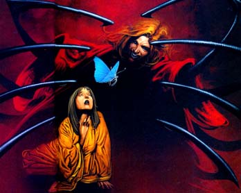 No princípio, o filho parido de Rowena parecia humano o bastante. Mas não mais cedo estava ao seu peito uma luz vermelha que flamejou em sua coluna vertebral e transformou em uma aranha vermelha provida de oito pernas. Até que os guardas fatiassem a aranha-criança pela metade, eles já estavam muito atrasados. Tinha chupado toda a umidade do corpo de sua mãe, enquanto deixando apenas pó e cabelo na forma áspera de uma mulher.