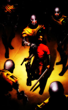 No interior poeirento de metal do que parecia ser uma antecâmara do laboratório de um mago louco, encontrou uma legião de homens de metal. Não eram cavaleiros humanos vestindo armaduras - cada um situava-se a pelo menos sete metros e meio de altura, e eram demasiadamente altos para serem mortais - ao invés disso pareciam criaturas feitas por um mago, um antigo mestre já falecido. Os seus braços e pernas eram de prata, seus corpos de ouro e suas cabeças de aço inoxidável. Parecia que uma camada de poeira de pelo menos dez anos cobria suas cabeças. Aparentemente estavam inanimados - como as mais bizarras esculturas de inimigos - então Arthur baixou sua arma e observou o espaço ao seu redor, procurando algum sinal de sua mulher, mas ela havia desaparecido.