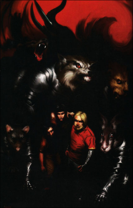 ao desaparecimento do rei Arthur, Gilead mergulhou na anarquia. Os cidadãos fugiram para reinos distantes a fim de escapar do repulsivo bando de cavaleiros-artilheiros que caçavam seus companheiros sob a luz ustera de uma lua sorridente. Os cães de caça dominavam mais uma vez os caminhos do Mundo Médio, embora nem mesmo eles estivessem a salvo das predações do morto- vivo Arthur Eld e de seu séquito canibal de zumbis bebedores de sangue e comedores de carne. E, embora os conselheiros de maior confiança de Arthur tivessem se desesperado diante do destino de seu soberano — certos de que ele havia sido transformado em algum tipo de monstro mutante pelas forças das Trevas Exteriores —, seus dois mais íntimos companheiros se recusaram a acreditar que, mesmo depois de morto, Arthur pudesse se tornar tal horror decadente e faminto por carne. Os nomes desses dois cavaleiros eram sir Alfred Johns e sir Bertrand Allgood, e juntos eles juraram resgatar seu monarca, ou morrer tentando.